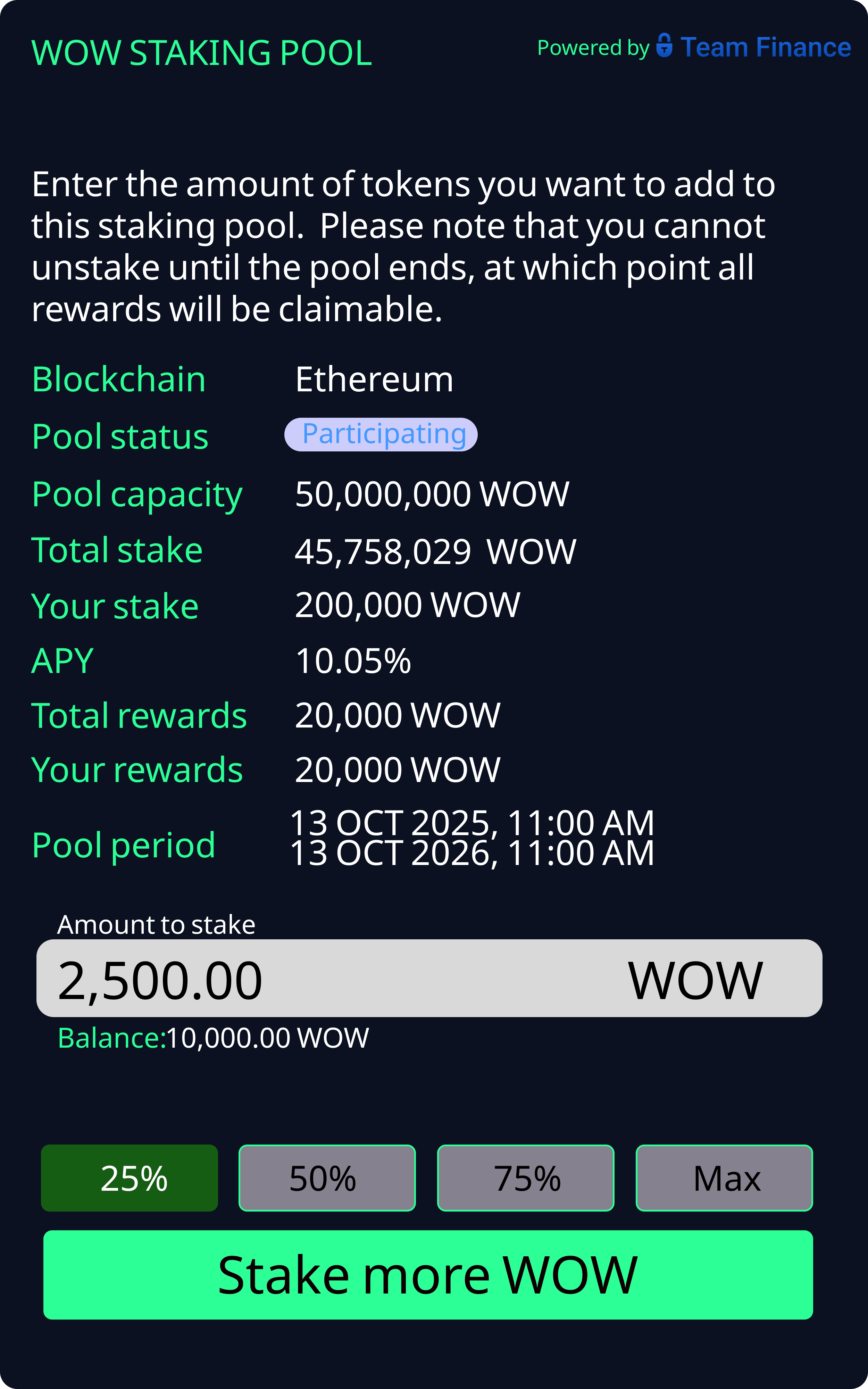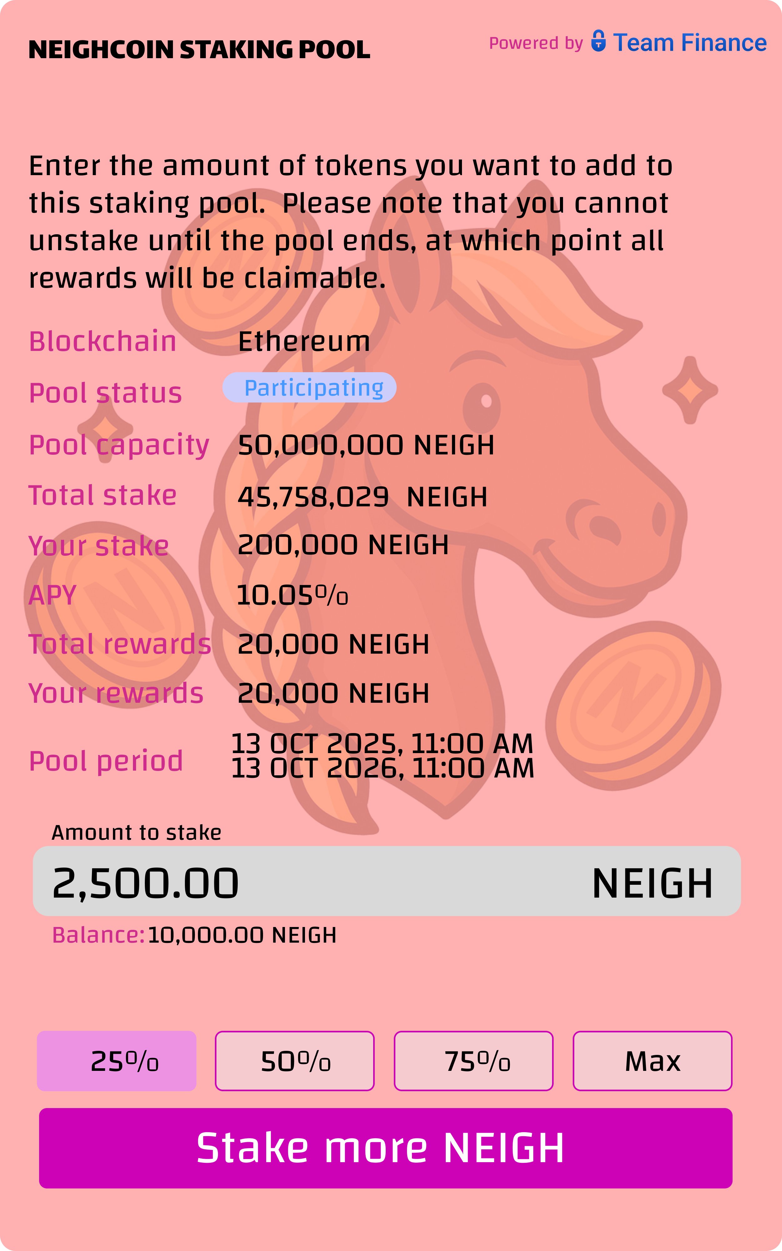 Configure your staking: Create your staking pools in the Team Finance dashboard, with options including custom reward tokens and reward top-ups. Or alternatively, make use of our ‘locked staking’ option, only available in our staking widgets, launching pools where users cannot unstake or claim rewards until the pre-determined time of the pool ending.